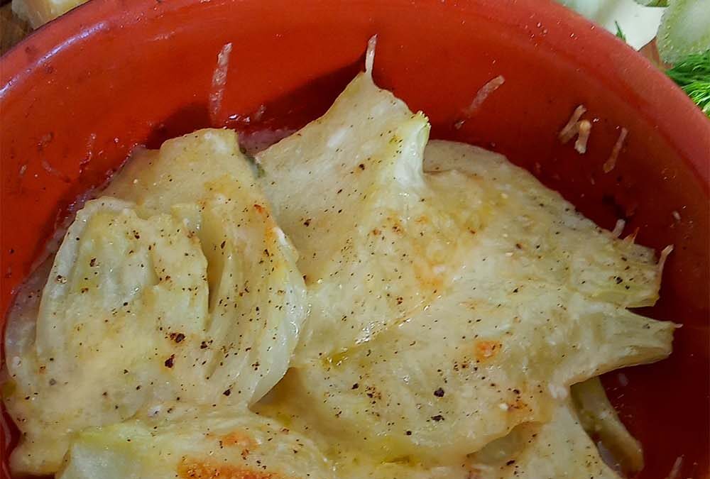 Quando i finocchi sono cotti trasferirli in una teglia da forno e cospargerli con un’abbondante spolverata di formaggio grattugiato. Mettere i il tegame in forno per altri 10 minuti a 200° e infine passarli al grill per dorare la superficie e il formaggio si sia sciolto formando una crosta croccante.