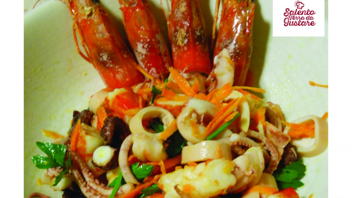 In una ciotola mettere il polpo tagliato a pezzi, i totani tagliati a rondelle e loro i ciuffi, e per finire i gamberoni privati del guscio. Aggiungere carota e sedano a pezzetti, del prezzemolo, dell’olio d’oliva, il succo di mezzo limone, regolare di pepe. Amalgamare e conservare l’insalata in frigo per un paio d’ore prima di gustarla, avendo cura di coprire la ciotola con della pellicola per alimenti.