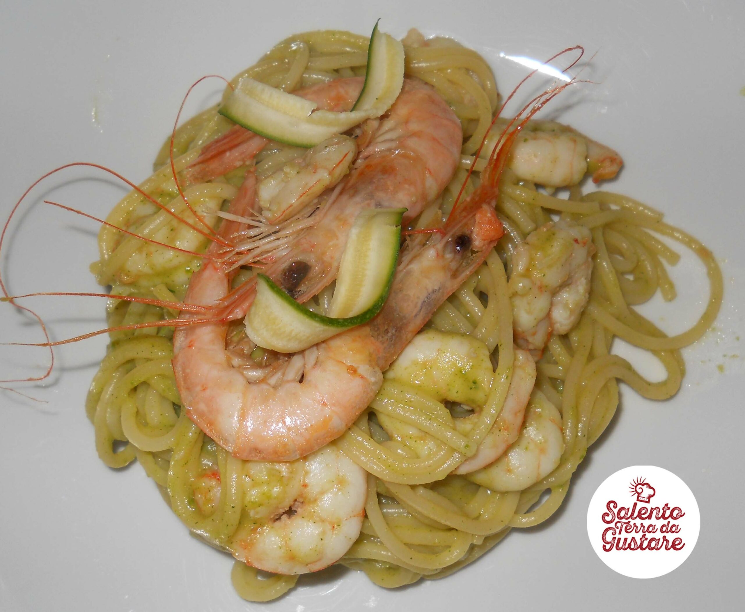 Ingredienti per gli spaghetti con gamberi e pesto di zucchine cotte:
